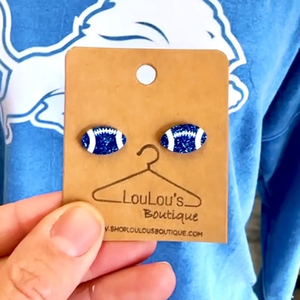 Get game ready with these mini glitter football earrings! Made with glitter acrylic, they come in three colors - traditional brown, blue and green! These cute earrings will guarantee you will be the cutest girl at the tail gate!