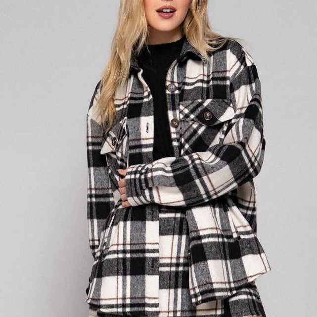 The Sawyer Plaid Button Down Shacket features a soft blend of materials, front chest pockets, side pockets, and eye catching colors and plaid patterns with a soft feel! Black and white colors with brown pin stripe detail.