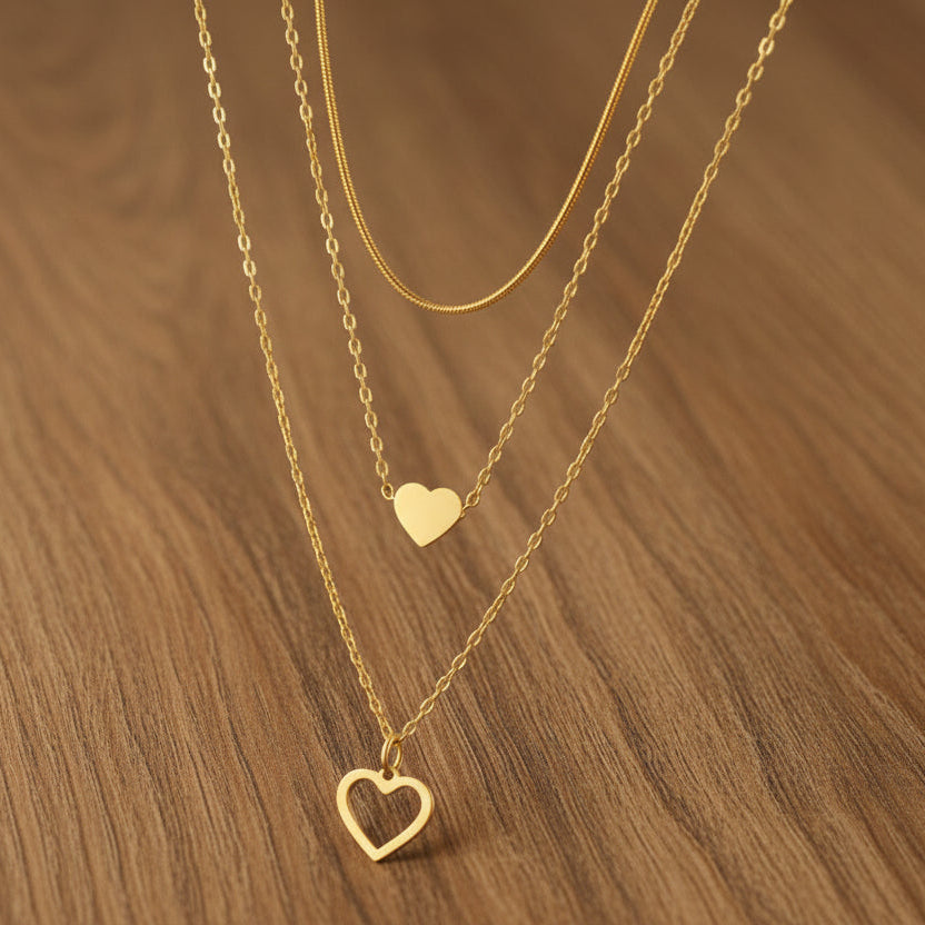 This gold plated necklace is chic and simple. Features three layers, two have heart charms and have a lobster claw clasp.